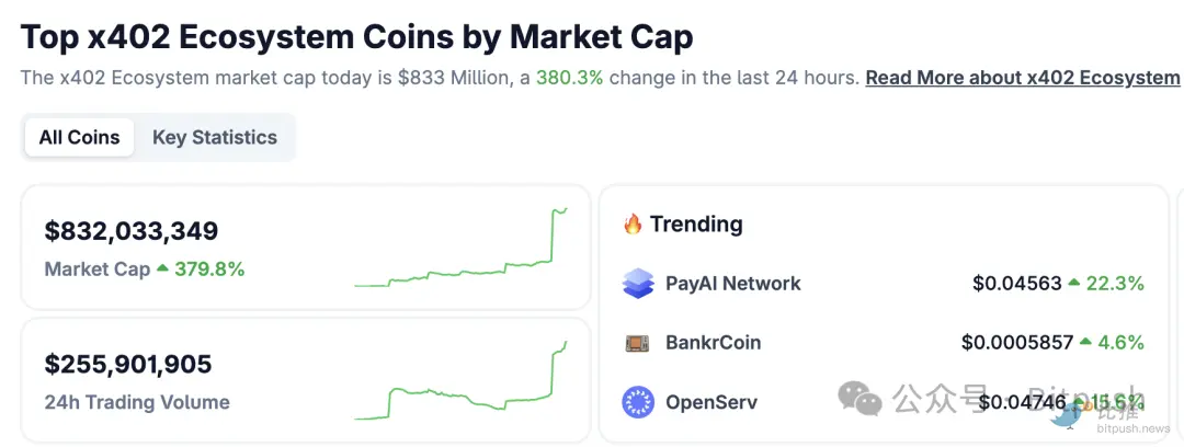 The total market value of the entire x402 ecosystem has also exceeded US$800 million on Coingecko.
