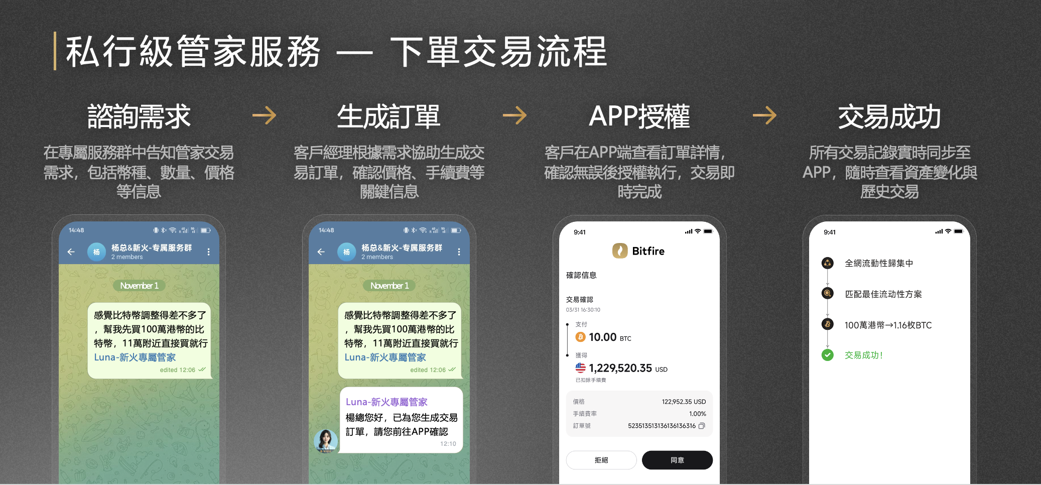 He further explained that Bitfire Prime is designed specifically for high-net-worth clients, with each client assigned a dedicated digital asset manager to provide tailored, personalized services. The account opening process is flexible and efficient, available in person or at a branch, and takes an average of only 3.25 days to complete—faster than typical virtual asset service providers. Membership requirements are based on Hong Kong Professional Investor (PI) standards, requiring at least HKD 8 million in traditional investment assets. Each client has their own exclusive community, receiving daily real-time market updates and analysis from the team. Users simply confirm trading instructions within the app, which are then executed by the manager—convenient and secure throughout the process. In addition, Bitfire Prime offers dedicated banking channels and large deposit/withdrawal services, one-stop asset management and investment banking services, and supports a diverse range of asset management products and virtual asset trusts. Clients can even make wills and arrange inheritance within their trust accounts.