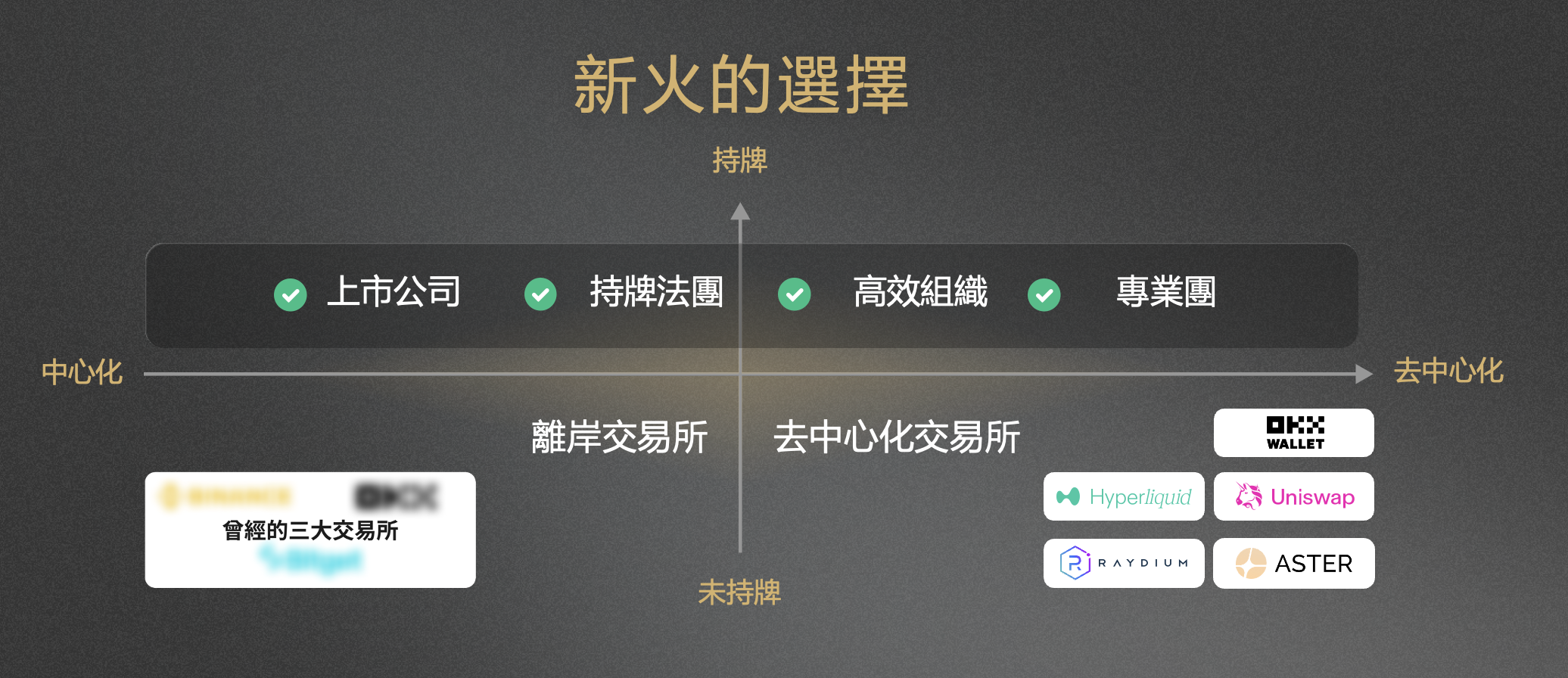 "In the past, the 'Big Three' exchanges often mentioned in the crypto world were mostly offshore platforms. But in recent years, the entire industry landscape has been changing rapidly, which can be summarized into two development directions, or two quadrants: one is decentralization, and the other is licensing," Weng Xiaoqi pointed out in an interview.