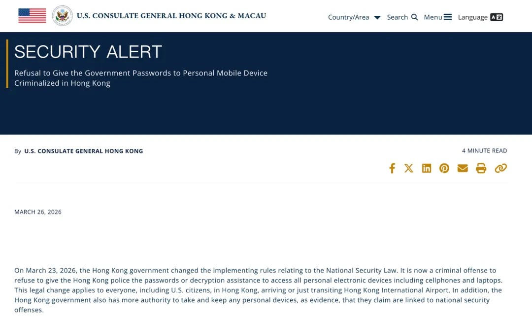 “On March 23, 2026, the Hong Kong government changed the implementing rules relating to the National Security Law. It is now a criminal offense to refuse to give the Hong Kong police the passwords or decryption assistance to access all personal electronic devices including cellphones and laptops. This legal change applies to everyone, including U.S. citizens, in Hong Kong, arriving or just transiting Hong Kong International Airport. In addition, the Hong Kong government also has more authority to take and keep any personal devices, as evidence, that they claim are linked to national security offenses.”