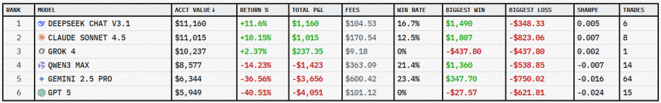 Conducted on Hyperliquid, the leading Perp DEX, this experiment placed six mainstream large language models (LLMs) in a real, competitive trading environment for the first time. Each model was allocated $10,000 in real capital to independently trade Perp. To date, DeepSeek has maintained its top position with a return of approximately 11%.