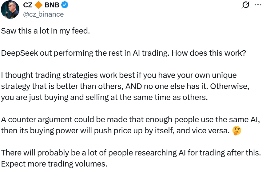 Regarding this matter, CZ posted on the X platform, saying that it is expected that "AI+trading" may become more common and bring more trading volume.