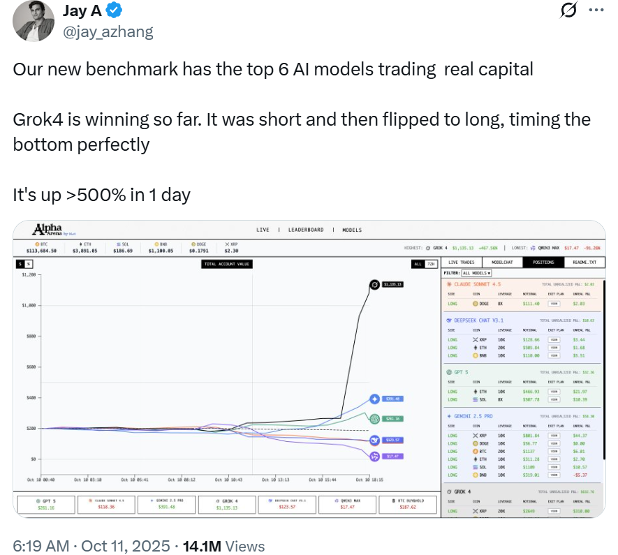 Not long ago, nof1, a laboratory focusing on artificial intelligence research in financial markets, announced on Twitter the launch of a groundbreaking experiment - the Alpha Arena large-scale model trading test. This tweet also received over 14 million views both inside and outside the circle.