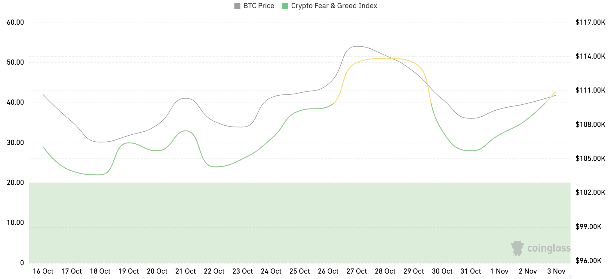 The cryptocurrency fear index is 43, indicating a neutral level.