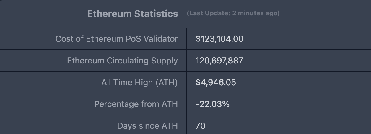 ETHUSD: Current price $3,850.54, all-time high $4,878.26, down approximately 22.03% from the high.