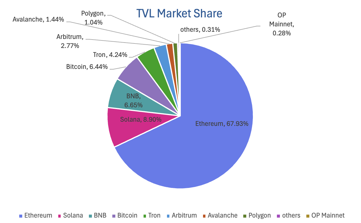 Based on public blockchains, the three public blockchains with the highest TVL are Ethereum (67.93%), Solana (8.9%), and BNB Chain (6.65%).
