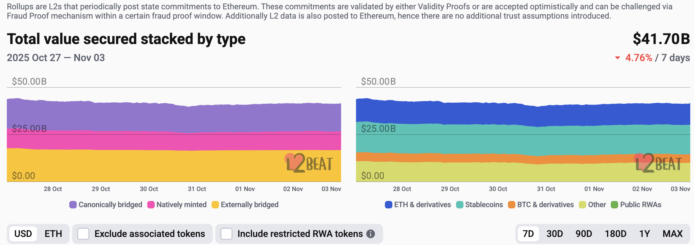 According to L2Beat data, the total TVL of Ethereum Layer 2 is $41.7 billion, a 4.6% decrease this week compared to last week ($43.73 billion).
