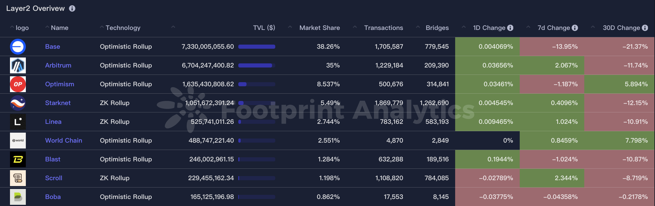 Base and Arbitrum occupy the top positions with market shares of 38.26% and 35% respectively. Base's market share has slightly decreased over the past week, while Arbitrum's has slightly increased.