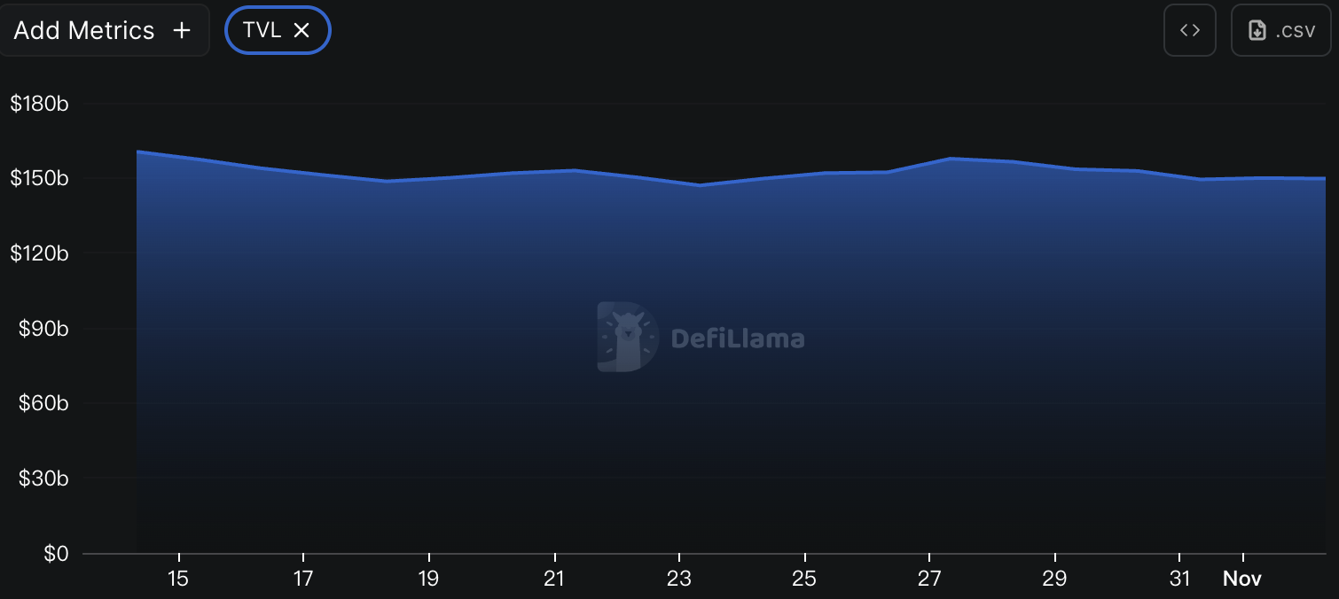 According to DeFiLlama data, the total TVL of DeFi this week was $149.6 billion, a decrease of approximately 5.01% from $157.5 billion last week.
