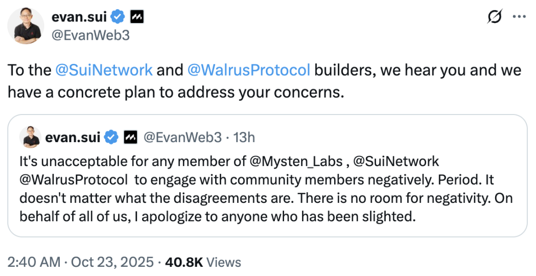 After realizing that a team member had made inappropriate comments, Sui co-founder and CEO Evan Cheng apologized to everyone who was slighted and stated that no matter the disagreement, any member of Mysten Labs, Sui, or Walrus engaging in negative communication with the community is permitted. Evan Cheng then stated that he would provide Sui and the Walrus builders with a concrete plan to resolve the issue.