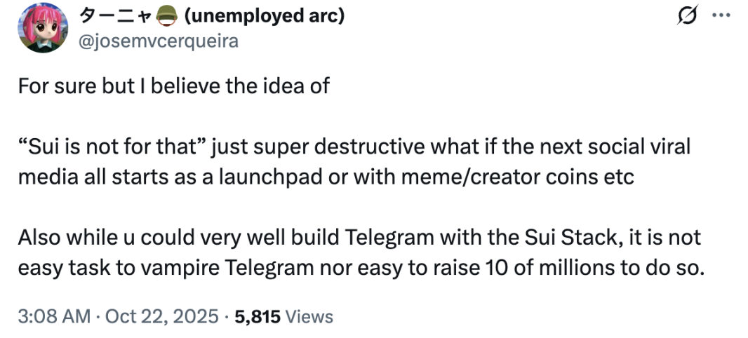 These complaints quickly drew a barrage of criticism from die-hard fans. A user with the handle @0xairtx took a particularly extreme approach, claiming the two individuals making the comments should be ashamed of their comments because they were only interested in issuing tokens, not developing products. Sui's stack was designed to facilitate product development. This user argued that Sui isn't a degen chain, but rather a "chain designed to restructure the internet," and therefore shouldn't support these "meaningless" applications.