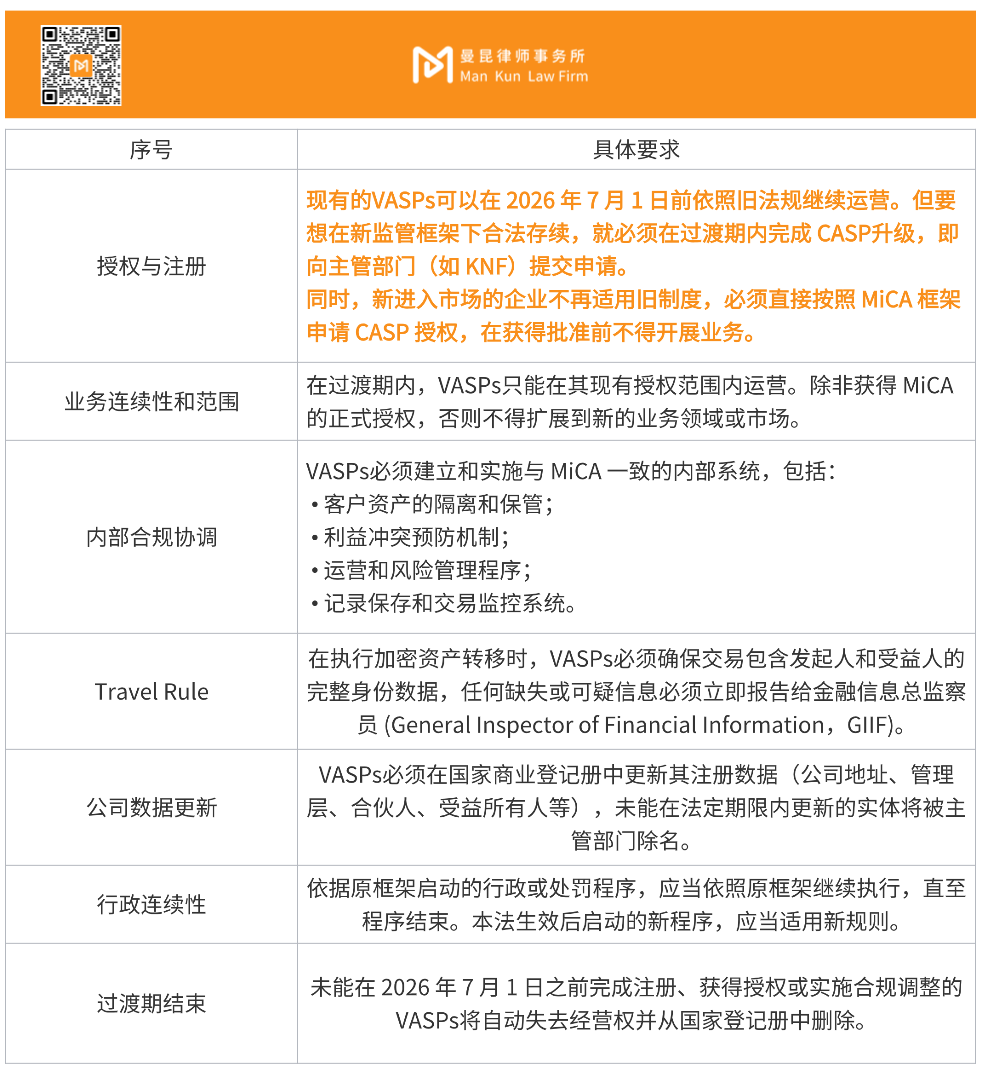 To facilitate a smooth market transition and avoid operational disruptions, the bill establishes a transition period for existing VASPs. VASPs currently registered under anti-money laundering regulations may continue to operate under existing rules until July 1, 2026, but must gradually upgrade to the new standards until they obtain CASP authorization or meet the expiration date. The following are the specific requirements for this transition period. Market participants should also pay attention to the implementation of the secondary rules supporting the bill.