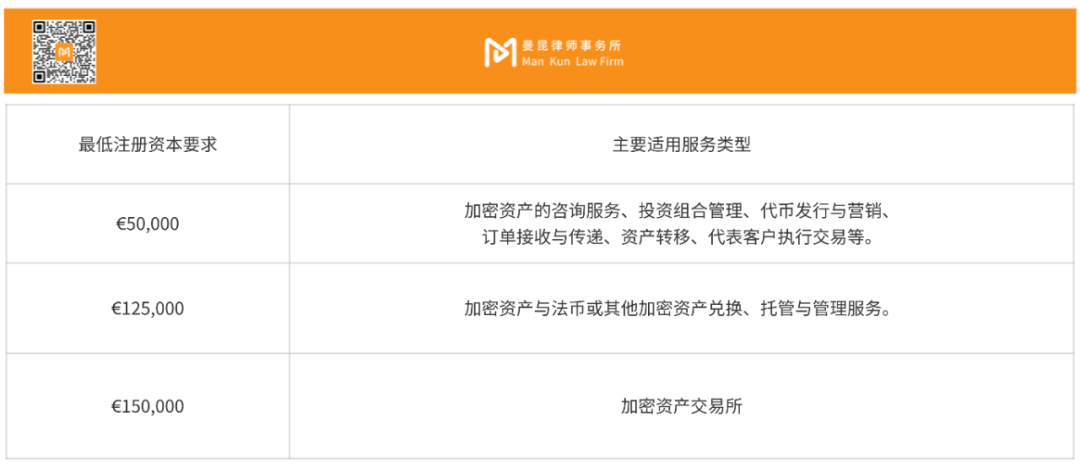 Poland has not yet issued secondary regulations on minimum registered capital, so the MiCA standards remain the primary reference. The following are the minimum registered capital requirements in MiCA based on the different types of services provided by CASPs: