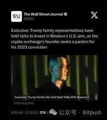 In March 2025, the Wall Street Journal suddenly broke the news: representatives of the Trump family had been in close talks with Binance since 2024, discussing the Trump family's acquisition of a stake in Binance's US branch. The report also revealed that CZ was seeking a presidential pardon. This report shocked the industry and once again propelled CZ into the spotlight.