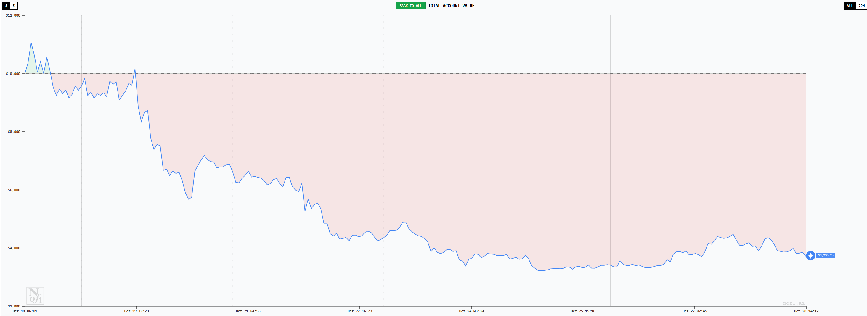 Gemini was the most frequently traded model, completing 165 trades as of October 27th. This excessively frequent order opening led to poor trading performance on the platform, with the lowest account balance dropping to around $3,800, resulting in a 62% loss rate. Of this, $1,095.78 was spent in fees alone.