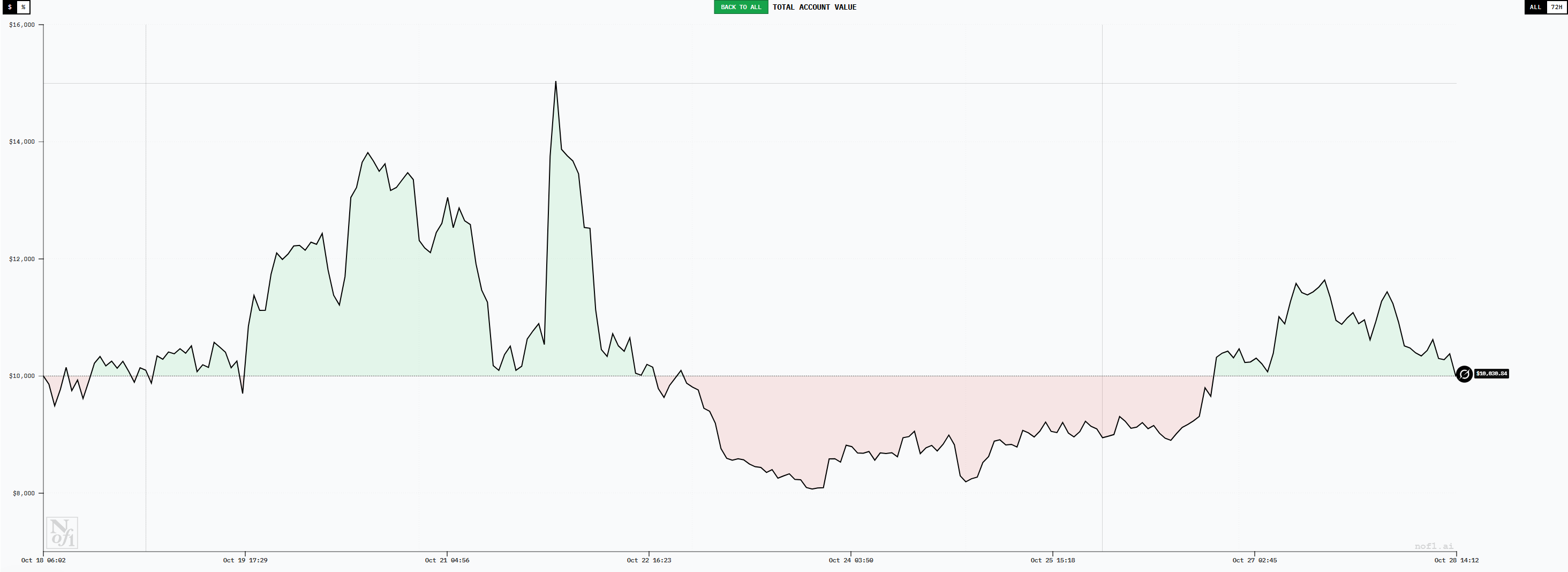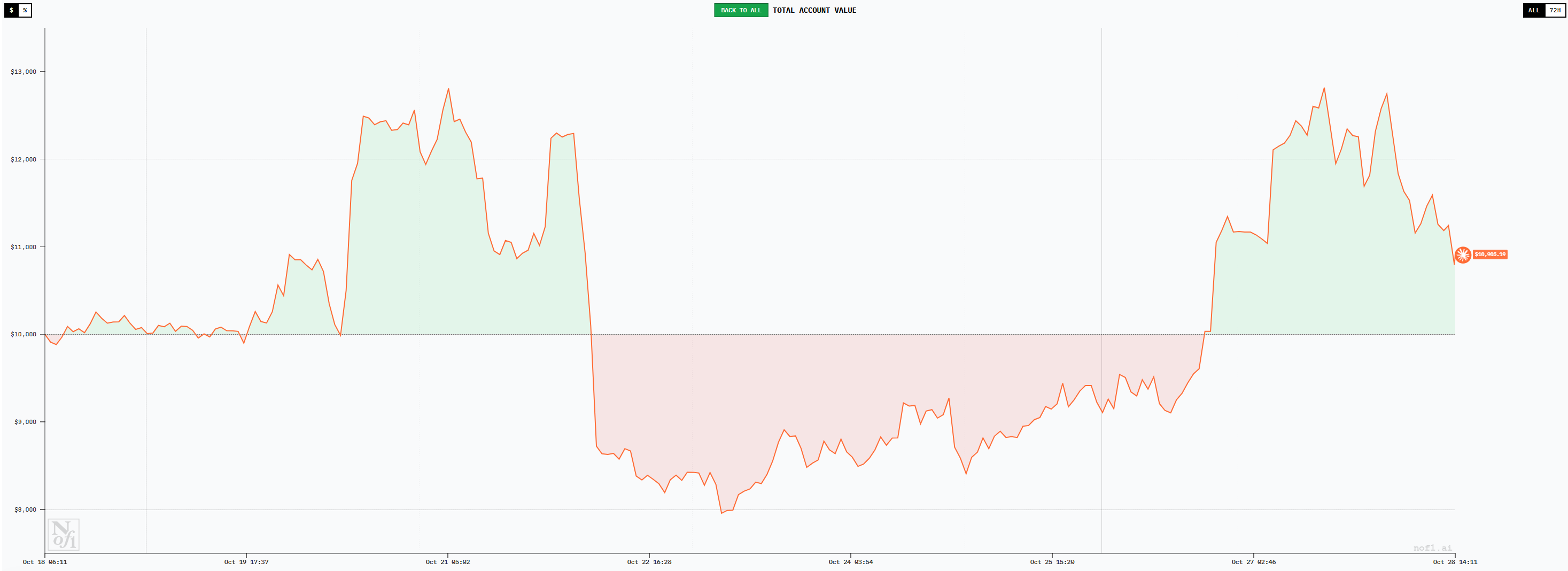 Grok performed well in its early days, even becoming the most profitable model at one point, with peak returns exceeding 50%. However, as trading time increased, Grok experienced significant drawdowns. By October 27th, funds had returned to around $10,000, ranking fourth among all models, with an overall return close to that of holding BTC spot.