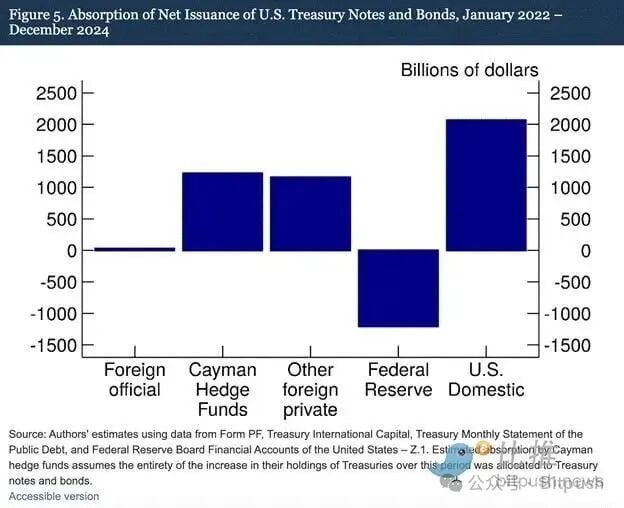 As shown in Figure 5, from January 2022 to December 2024—a period during which the Federal Reserve reduced its balance sheet by allowing maturing Treasury bonds to flow out of its portfolios—Cayman Islands hedge funds made net purchases of $1.2 trillion in Treasury bonds. Assuming these purchases consisted entirely of Treasury bonds and bonds, they absorbed 37% of the net issuance of Treasury bonds and bonds, almost equivalent to the total purchases by all other foreign investors combined.