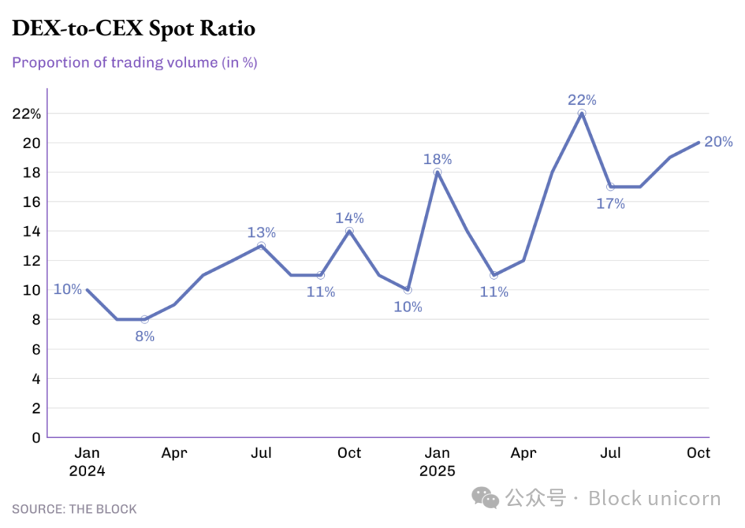 So far this year, decentralized exchanges (DEXs) have accounted for nearly 20% of all spot trading volume, up from just over 10% in 2024. While centralized exchanges (CEXs) still dominate the market due to their superior fiat deposit channels, DEXs have become the preferred choice for users seeking speed, composability, anonymity, and self-custody.