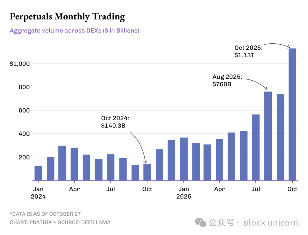 But 2025 changed that trend. The average monthly trading volume of perpetual contracts more than doubled, from $332 billion in the first quarter to $688 billion in the third quarter. In October alone, its trading volume exceeded $1.13 trillion, marking the first time that on-chain derivatives trading volume has surpassed one trillion dollars, more than twice the size of the DEX spot market.