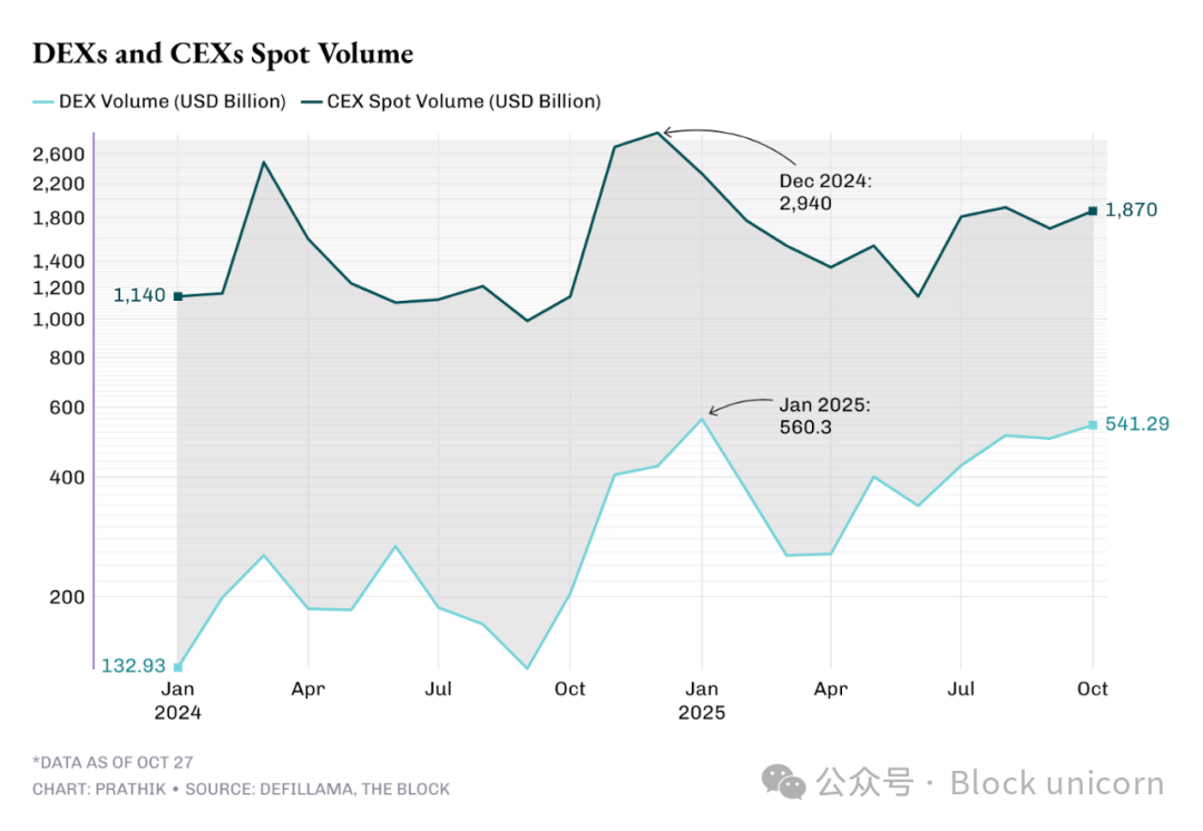 In the first quarter of 2025, the average monthly trading volume on DEXs was $395 billion, and in the second quarter it was $332 billion. By the third quarter of 2025, the average monthly trading volume had increased by 50% to $480 billion. October's trading volume had already exceeded $540 billion.