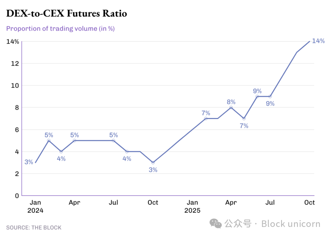 In 2024, decentralized exchanges handled less than 5% of global futures trading volume. By mid-2025, this figure had doubled to 10%, and by October it had reached 14.3%, marking the highest percentage of on-chain derivatives relative to centralized exchanges.