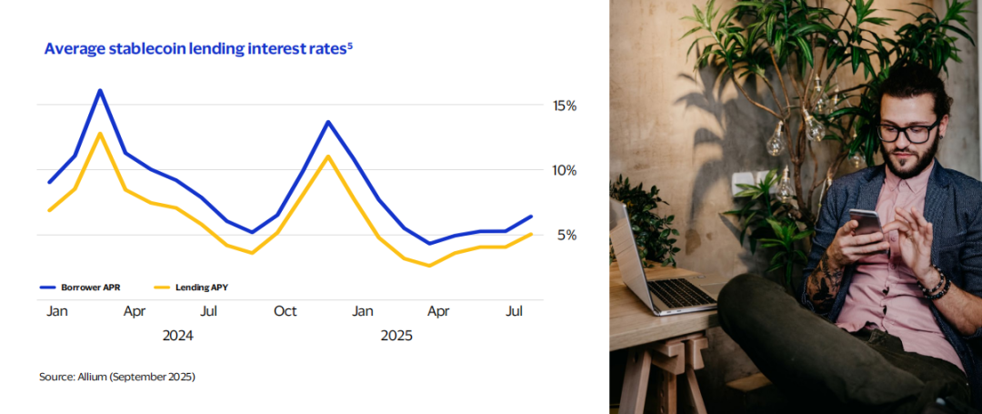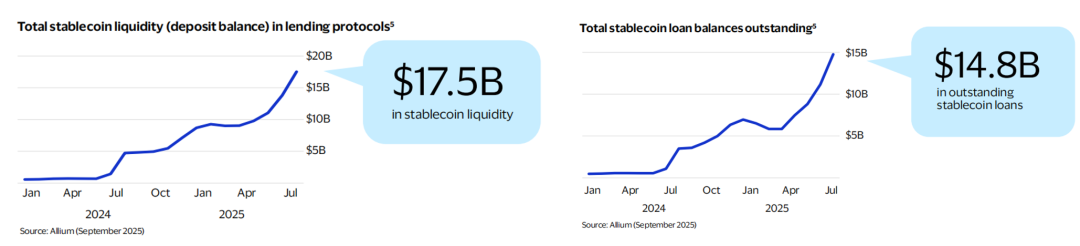 Active loan balances and the supply of stablecoins deposited in lending protocols also rebounded, exceeding their previous peaks. In August 2025, an average of $17.5 billion in stablecoins remained in the protocols, of which $14.8 billion (84%) was actively lent out as loans.