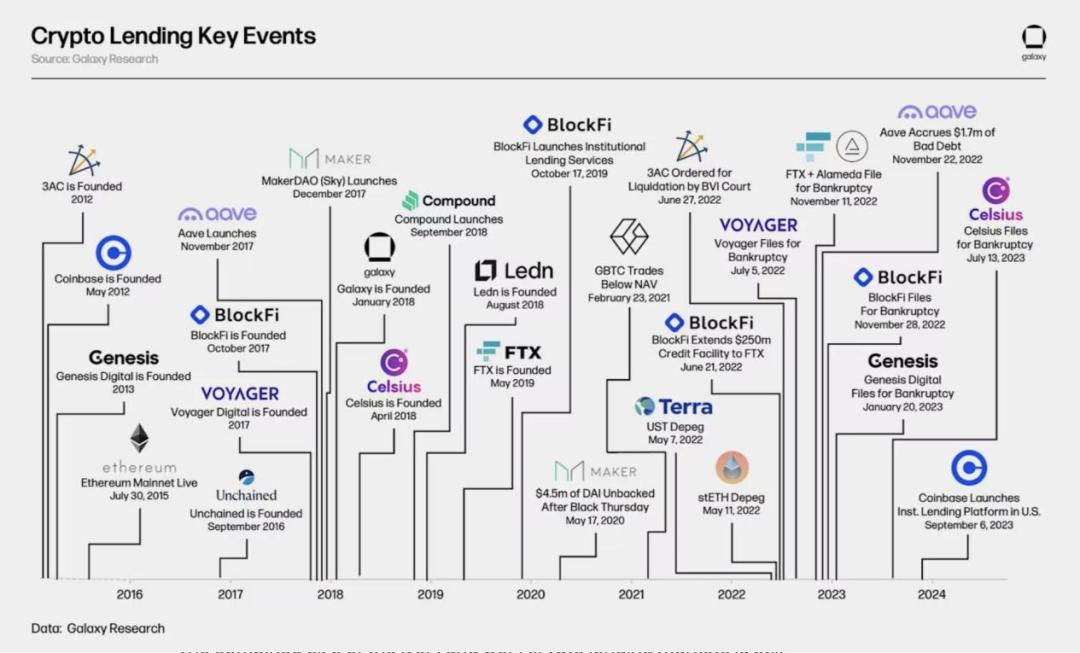 Although on-chain and off-chain crypto lending didn't become widely used until late 2019/early 2020, some current and historically significant players were founded as early as 2012. Genesis, founded in 2013, is particularly noteworthy, having once handled $14.6 billion in loans. On-chain lending giants like Aave, Sky (formerly MakerDAO), and Compound Finance launched on Ethereum between 2017 and 2018. The emergence of these on-chain lending/borrowing solutions was made possible by the advent of Ethereum and smart contracts, which officially launched in July 2015.