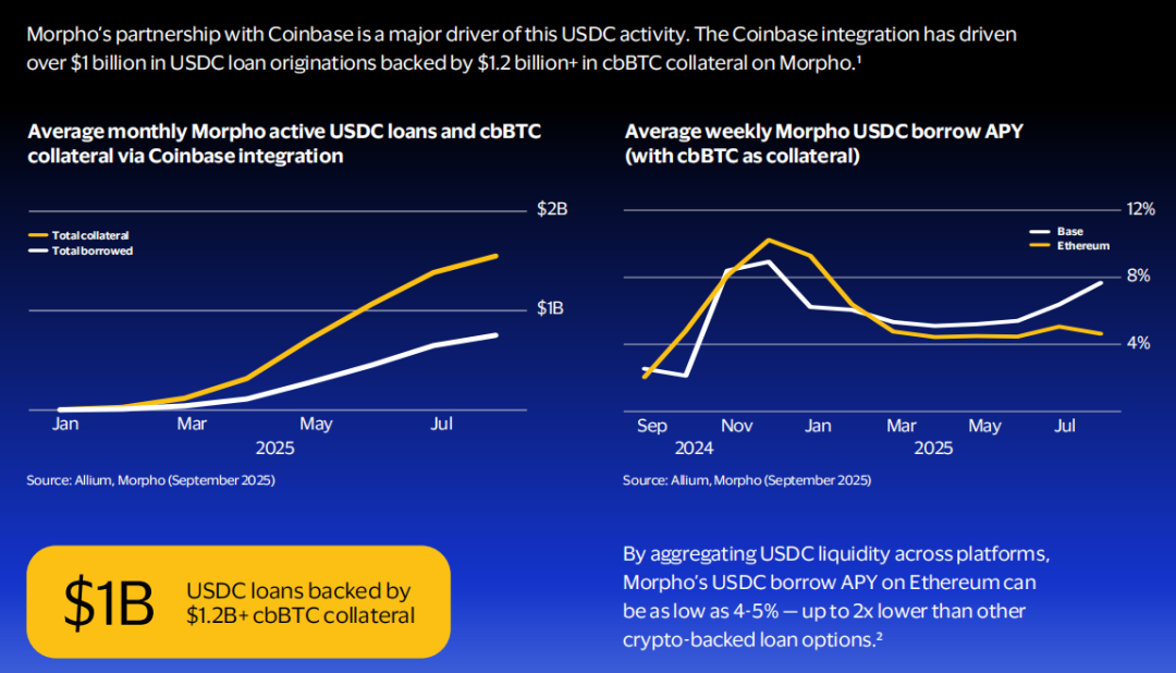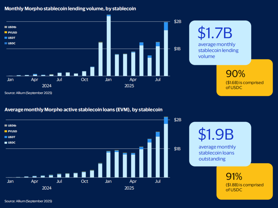Currently, Morpho's monthly stablecoin lending volume reaches $1.7 billion, with $1.9 billion in outstanding stablecoin loans. USDC accounts for $1.6 billion (90%) of this lending volume and $1.8 billion (91%) of outstanding loans. This USDC activity is primarily driven by its partnership with Coinbase: through the Coinbase integration, Morpho has facilitated over $1 billion in USDC loans, collateralized by over $1.2 billion in cbBTC.