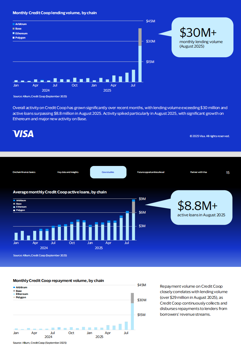 On the acquirer side, crypto-native payment processor Coinflow also uses Credit Coop to provide merchants with an instant advance payment service using USDC, where "card payments have not yet been settled but funds have already been received."