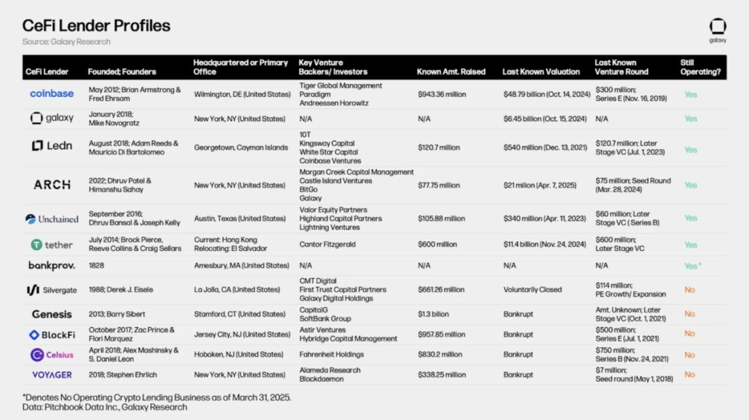 The chart below compares some of the largest CeFi crypto lenders in history. Some companies offer multiple services to investors. For example, Coinbase, while primarily an exchange, also provides credit services to investors through over-the-counter cryptocurrency loans and margin financing.
