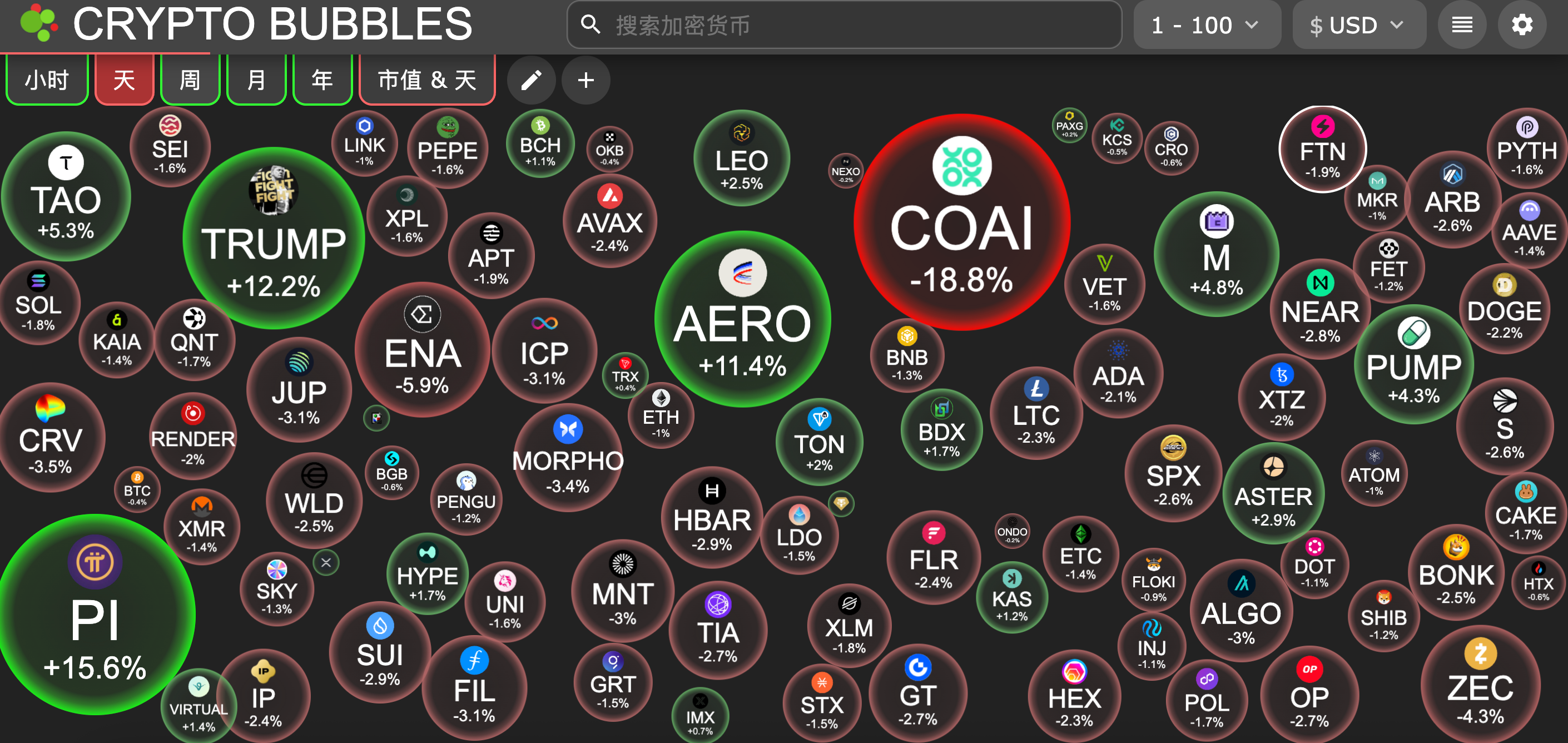 The top 100 cryptocurrencies by market capitalization with the largest gains today are: Pi Network up 15.6%, Official Trump up 12.2%, Aerodrome Finance up 11.4%, Bittensor up 5.3%, and MemeCore up 4.8%.