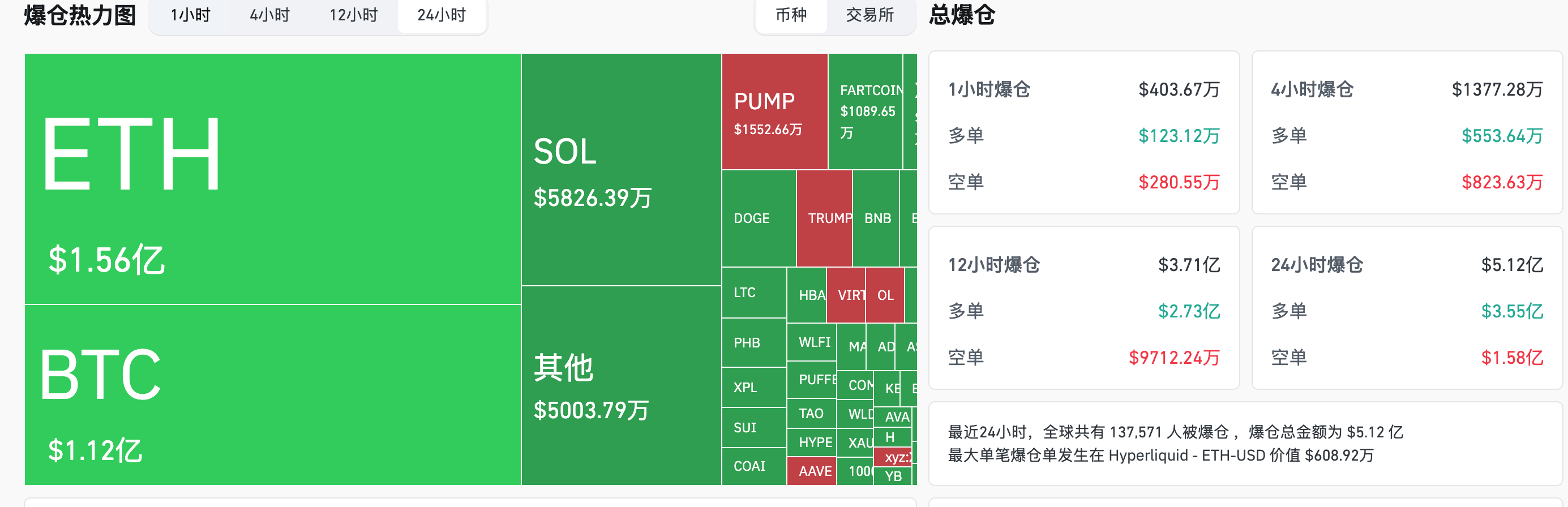 24-hour liquidation data: A total of 137,571 people worldwide were liquidated, with a total liquidation amount of $512 million. This included $112 million in BTC liquidations, $156 million in ETH liquidations, and $58.26 million in SOL liquidations.