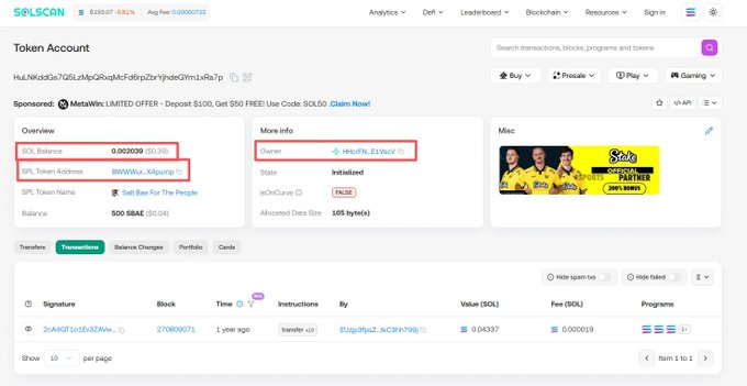 The image below, created by Solscan, shows the status of the MEME token SBAE, where SOL Balance 0.002039 represents the rental fee.
