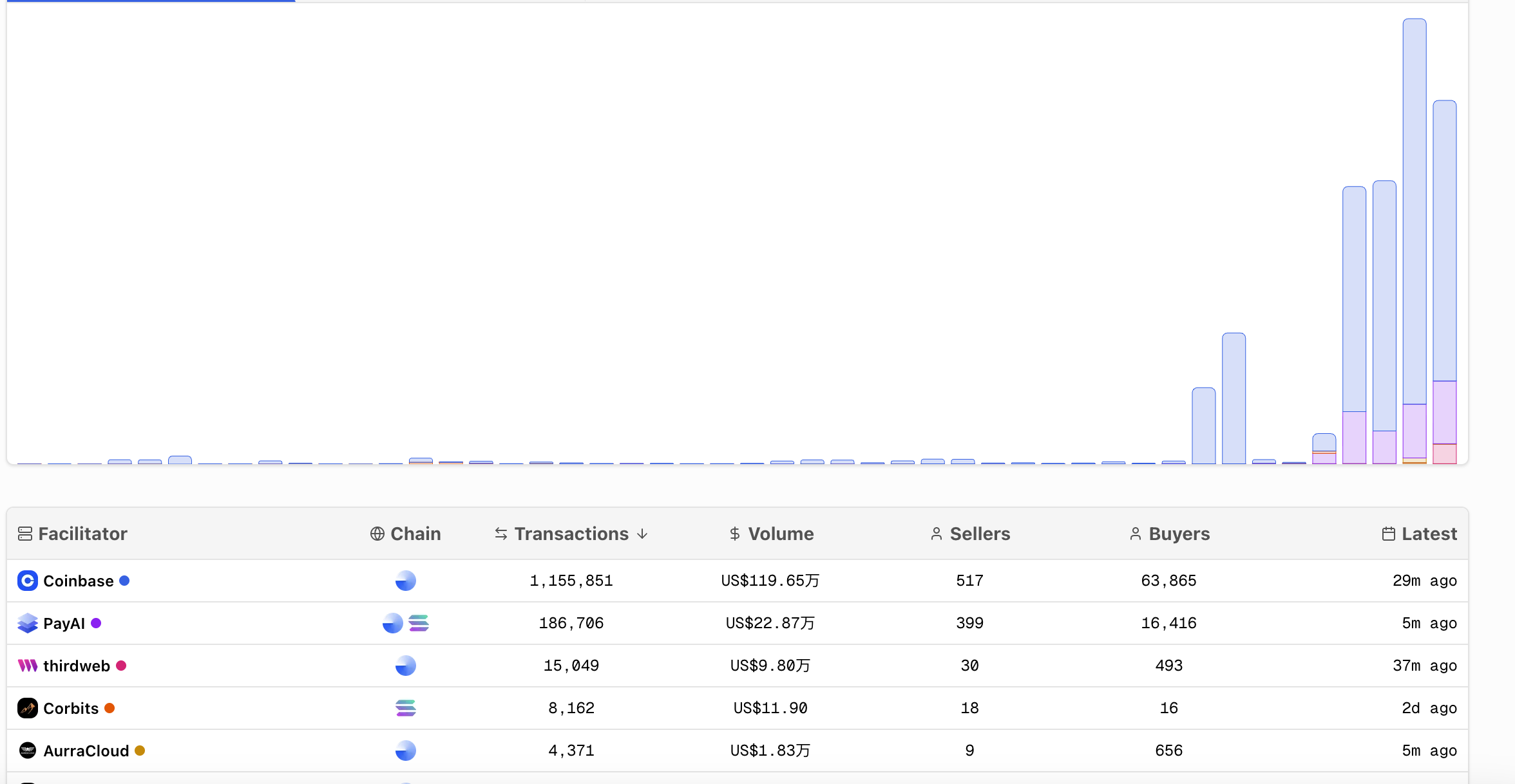 From the perspective of transaction execution entities, Dune data shows that transaction activity is highly concentrated in a few core facilitators. Coinbase Facilitator (Base) is the largest payment processing service, processing over $1.004 million in cumulative transaction volume and over 1.16 million transactions. The second-largest facilitator, PayAI (Base and Solana), has processed over $219,000 in cumulative transaction volume and over 175,000 transactions. The remaining facilitators operate on smaller scales.