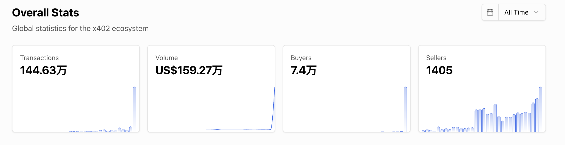 The surge in trading volume is inseparable from the rapid expansion of the number of buyers and sellers. As of October 26, x402's current number of buyers has reached 74,000, an increase of 70,000 over the past week; the number of sellers is 1,405, a 327.1% increase over the past three days.