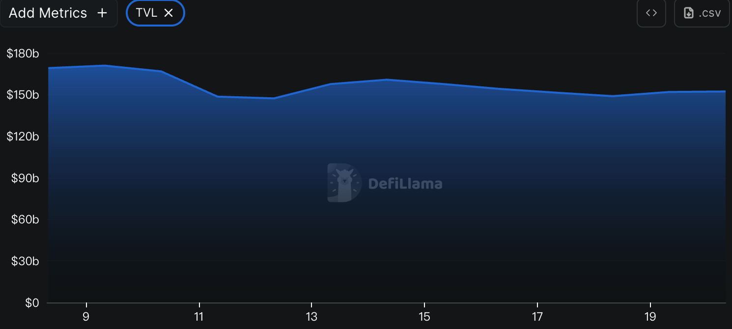 According to data from DeFiLlama, the total TVL of DeFi this week was $152.2 billion, down about 3.3% from $157.4 billion last week.
