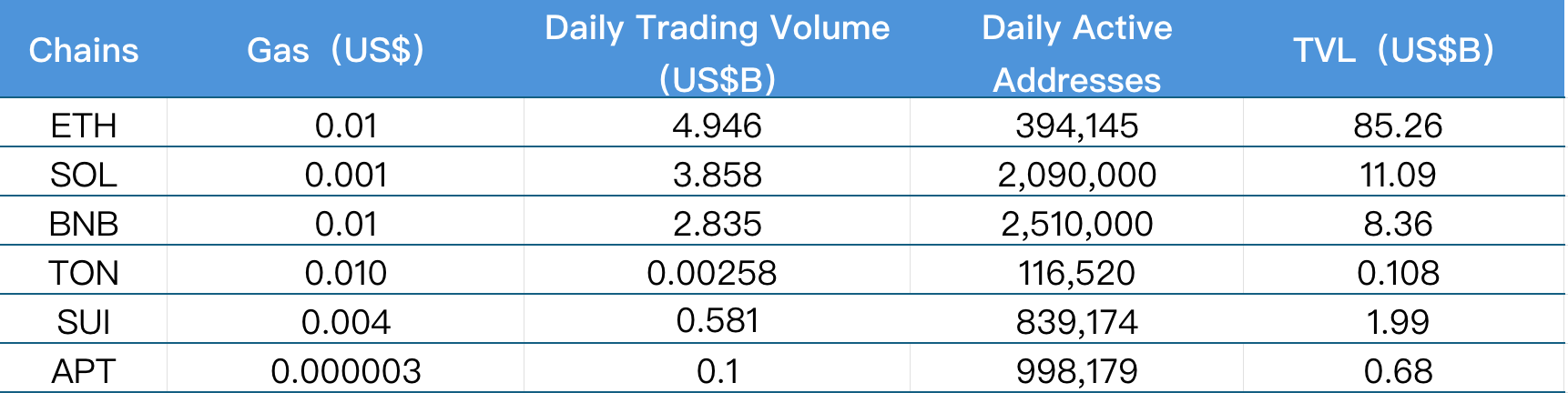 The main analysis is based on daily transaction volume, daily active addresses, and transaction fees. The current Layer 1 data includes ETH, SOL, BNB, TON, SUI, and APTOS.