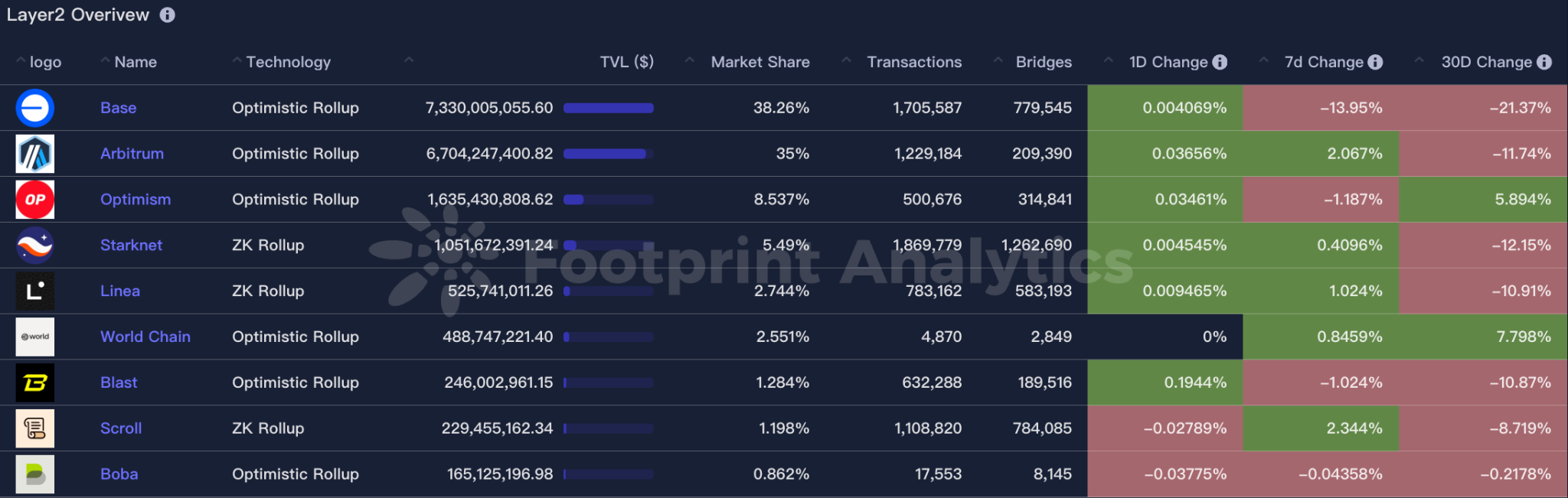 Base and Arbitrum occupy the top position with 38.26% and 35% market share respectively. Base chain's market share has slightly decreased in the past week, while Arbitrum's has slightly increased.