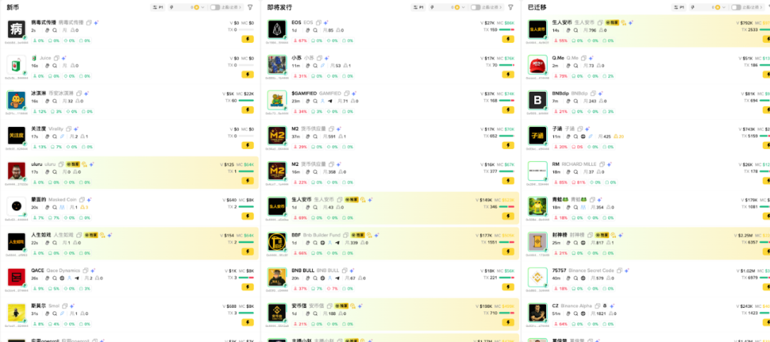 So, how can we use Meme Rush to find and participate in early-stage meme projects? Its interface is usually divided into three core areas, representing the different stages of the project: new coins, upcoming issuance, and migrated.