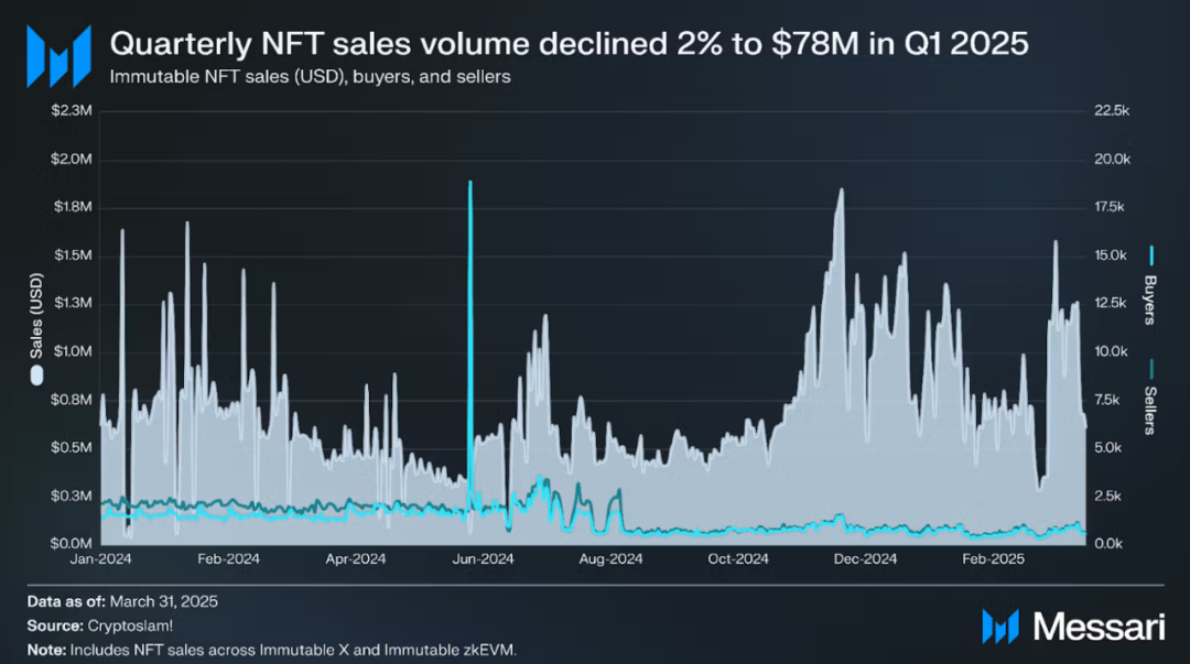 The market initially rebounded rapidly in the summer, but then cooled down: According to CryptoSlam, sales reached $574 million in July 2025 (the second highest for the year), but in September, sales fell by about 25% month-on-month due to a decline in risk appetite in the overall crypto market.