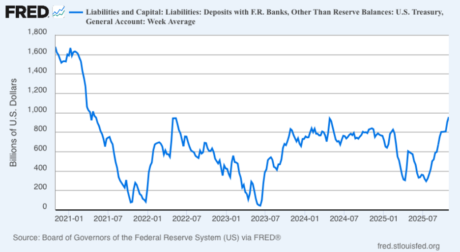 | Since the beginning of 2025 | Rapid rise (approaching 1 trillion again) | The government is making precautionary reserves for new fiscal year spending and potential shutdowns; TGA restocking has tightened liquidity again. |