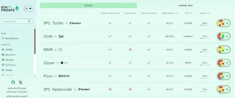 Currently, ETHProofs.org, supported by the Ethereum Foundation, has become the core tracking platform for the L1 zkEVM Realtime Proving (RTP) route, used to publicly display the performance, security, and mainnet adaptation progress of various zkVMs.