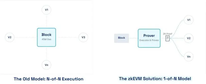 - 1 of N new paradigm: A small number of provers execute the entire block and produce short proofs; the entire network only verifies in constant time. Verification costs are much lower than re-execution, allowing for safe increases in L1 gas limits and reduced hardware requirements.