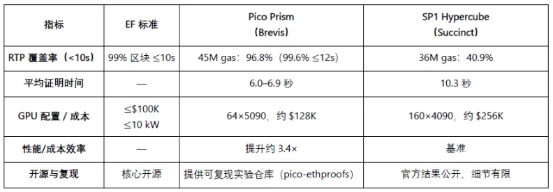 - Hardware strategy: Under the configuration of 64×RTX 5090 GPU (about $128K), Pico Prism achieved an average proof time of 6.0–6.9 seconds and 96.8% RTP coverage, with a performance/cost ratio improved by about 3.4 times, which is better than SP1 Hypercube (160×4090 GPU, 10.3 seconds).