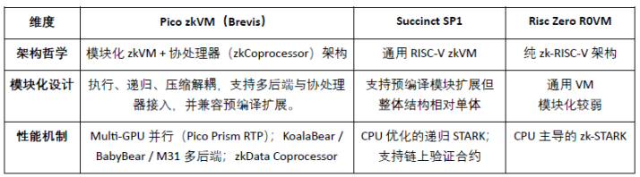 Compared with the relatively monolithic RISC-V zkVM architecture of Succinct SP1 and the general RISC-V execution model of RISC Zero R0VM, Pico achieves decoupling and expansion of the execution, recursion and compression stages through Modular zkVM + Coprocessor System, supports multi-backend switching and coprocessor integration, and forms a differentiated advantage in performance and scalability.