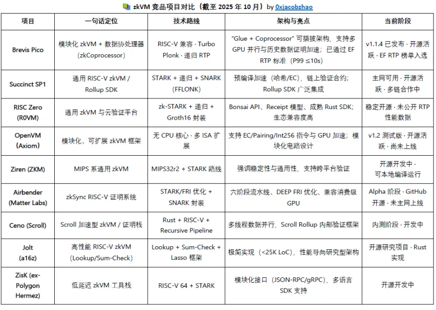 - The second-tier teams, RISC Zero, ZisK, and ZKM, continue to explore ecosystem compatibility and lightweight design, but have yet to disclose complete RTP metrics (latency, power consumption, CAPEX, security bits, proof size, and reproducibility). Scroll (Ceno) and Matter Labs (Airbender) are attempting to extend Rollup technology to the L1 verification layer, demonstrating the evolution from L2 capacity expansion to L1 verifiable computing.