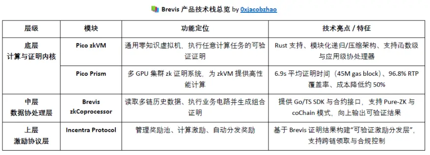Brevis builds a multi-chain trusted computing layer with "universal zkVM (Pico/Prism)" and "data coprocessor (zkCoprocessor)": the former solves the problem of verifiability of arbitrary calculations, and the latter realizes the business implementation of historical and cross-chain data.