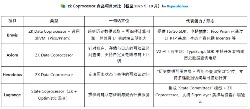 The current zk-coprocessor market is dominated by Brevis, Axiom, Herodotus, and Lagrange. Brevis leads the pack with its "ZK data coprocessor + general-purpose zkVM" architecture, combining historical data access, programmable computation, and L1 RTP capabilities. Axiom focuses on verifiable queries and circuit callbacks; Herodotus specializes in historical state access; and Lagrange optimizes cross-chain computing performance with its ZK+Optimistic hybrid architecture. Overall, zk-coprocessors are becoming a trusted computing interface connecting DeFi, Reliable Web Apps (RWA), AI, identity, and other applications as a "verifiable service layer."