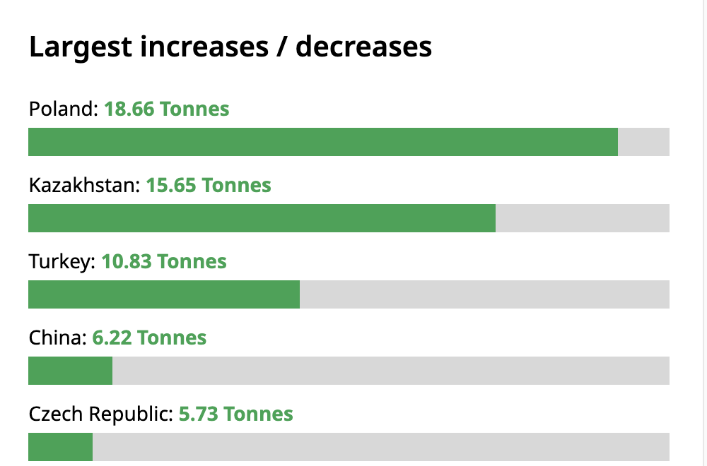 According to the World Gold Council's Q2 2025 data, Poland increased its holdings by 18.66 tons, followed closely by Kazakhstan with an increase of 15.65 tons. The People's Bank of China took a steady approach, increasing its holdings by 6.22 tons.