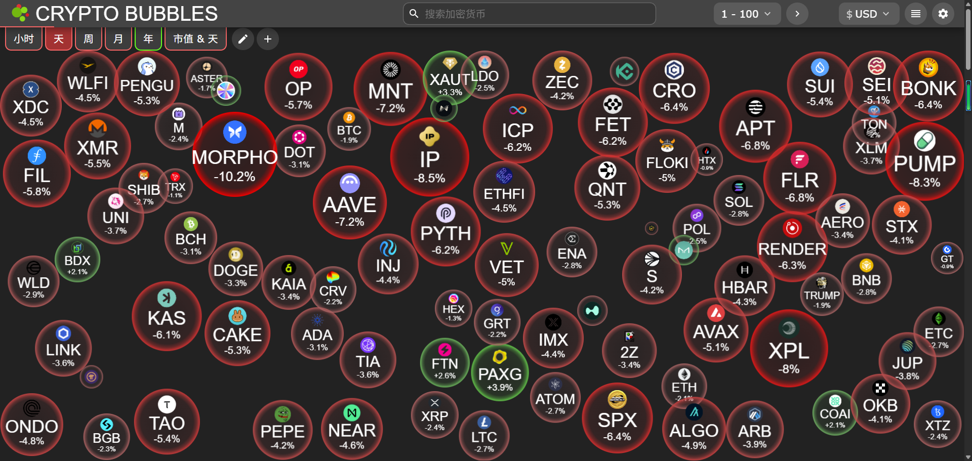 The top 100 cryptocurrencies with the largest increases today are: PAXG up 3.9%, COAI up 3.5%, XAUT up 3.3%, BDX up 2.5%, and FTN up 2.5%.